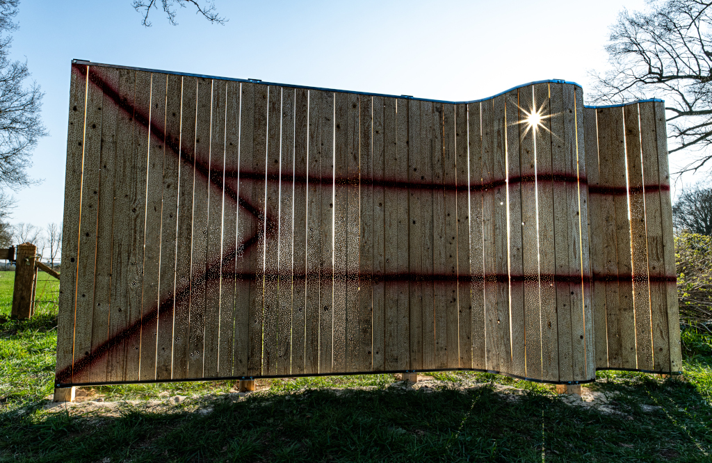 Alvorens we de kunstwandelroute afsluiten, staan we stil bij Ruim EENENZEVENTIGDUIZEND Gazagaten #nr. 23 van Jozef Kemperman. Kemperman heeft een houten muur in de natuur opgetrokken. De muur belemmerd het uitzicht op de omgeving. UITZICHTLOOS, een scheidingsmuur met daarop in rood de contouren van een vlag en 71.000 gaten. De vlag verwijst naar Gaza, de gaten naar de mensenlevens die de strijd tot 28 februari 2026 heeft gekost. “Hier gaten, daar mensenlevens.