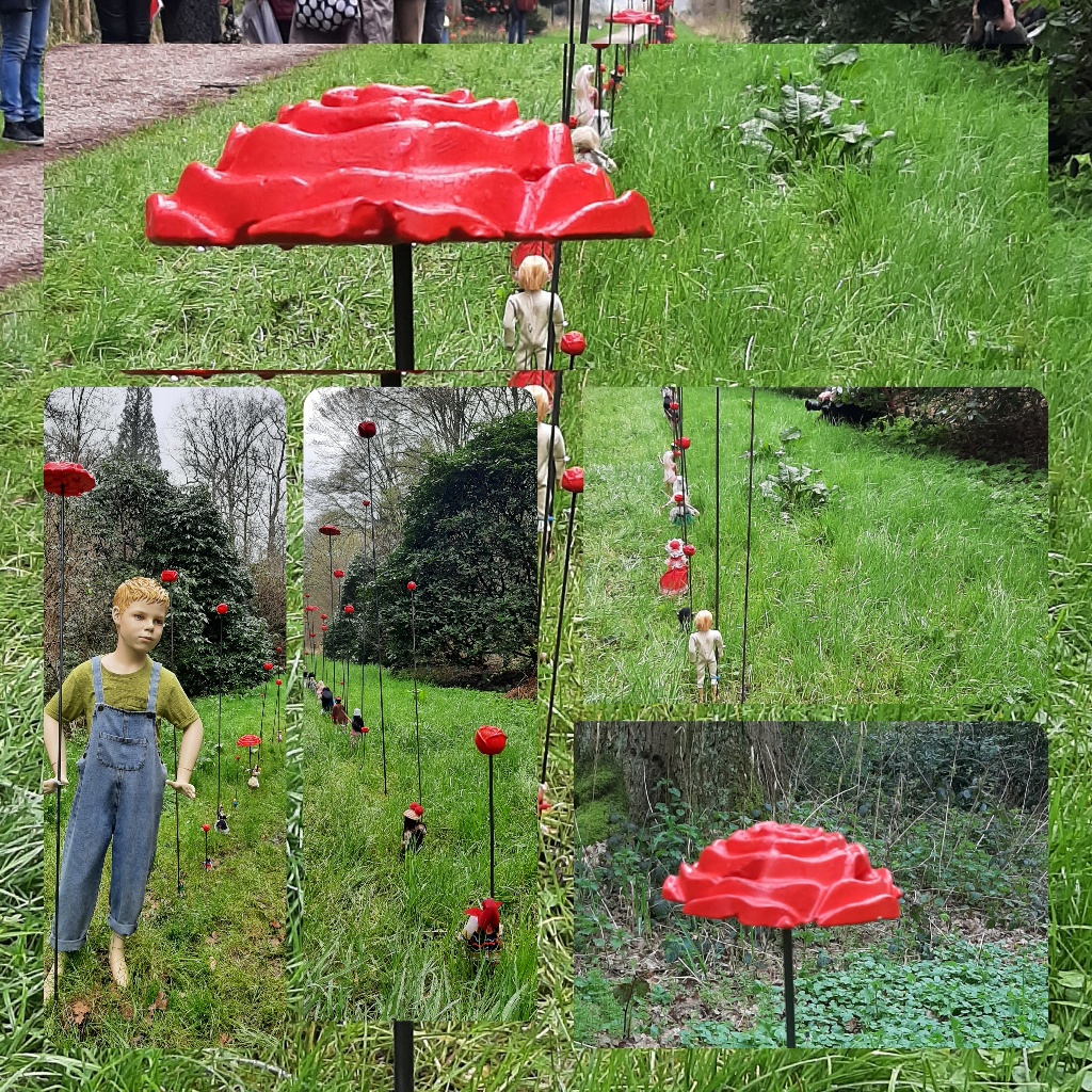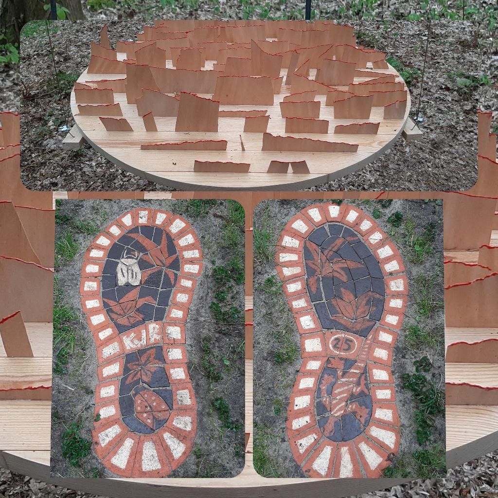 Hermine Grob heeft twee grote keramische voetafdrukken gemaakt. Haar foot print #nr 15 verwijzen naar onze voetafdruk, de impact van onze leefstijl op de aarde. Grob heeft keramiek gebruikt waarmee ze verwijst naar de natuur. De rood-wit geblokte randen verwijzen naar de luiken van het kasteel. Op een paar meter vanaf deze foot print beeldt Georg Paar klimaat-verandering #nr. 16 uit in hout. Paar’s werk vermeldt de opwarming van de aarde. De rode lijn die de symbolische bergen aftopt, symboliseert hier de klimaatverandering. Gerd Hagedorn leert ons dat waar libellen zijn, de natuur in balans is. Hij laat het zien in Natuur in de Cultuur #Nr. 17.
