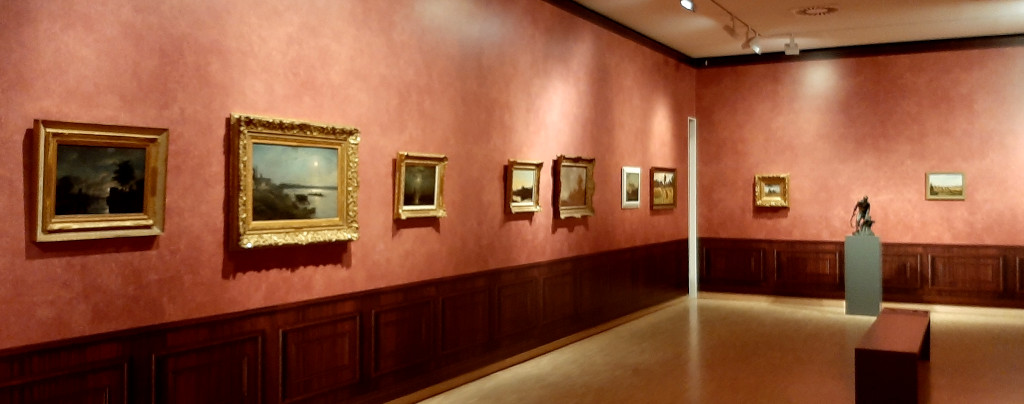 In de tweede zaal (boven) hangen twee thema’s die dichtbij elkaar komen: Maneschijn en Avondstond. Avondstond is de tijd rondom het ondergaan van de zon. Het is de tijd van rust en mijmeren. Dit gevoel herken je in het landschap bij avondstond van Suze Robertson (1855-1922).  De gouden gloed van de ondergaande zon schittert op het water. Ik zie mezelf hier wel zitten aan de oever van de stroom, genietend van het afscheid van een mooie zonnige dag. Bij Piet Mondriaan is het licht deels verborgen achter de eikenbomen. Zijn werk heet Boerderij onder eikenbomen Schets III (1906-1907).