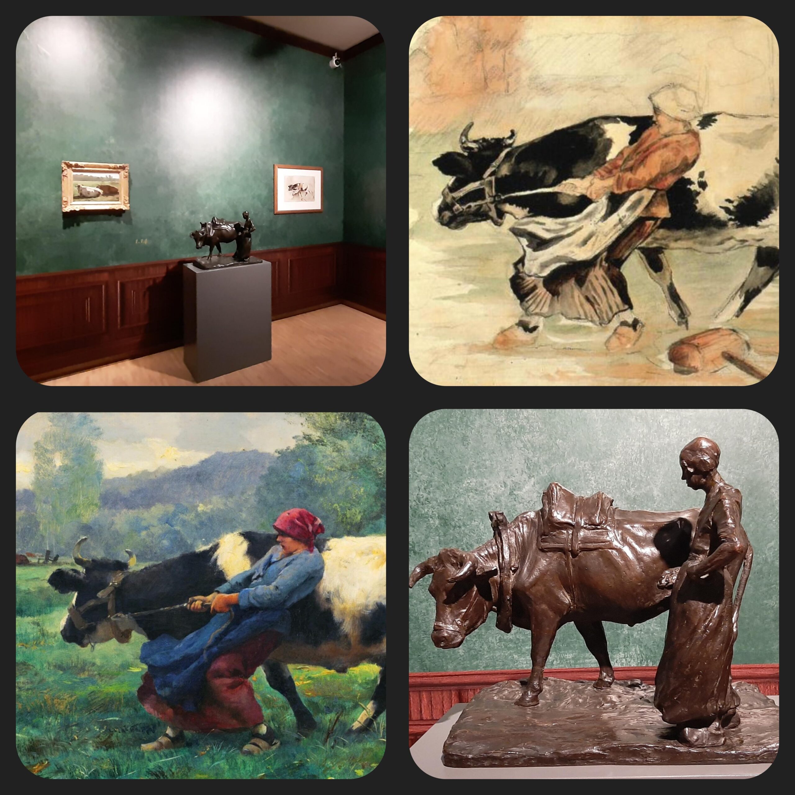 Een van de thema’s die mijn aandacht direct trok is ‘Vrouwen met koeien’. Je ziet een prachtig bronzen beeld van Charles van wijk (1875-1917). Het heet ‘terugkeer van den arbeid’. Een koe met een lading op zijn rug loopt naast een vrouw met een lange rok. De vrouw heeft haar rechterhand in haar rokzak, het geheel geeft een gevoel van voldoening: de dag zit erop, het werk is gedaan. Rechts van dit beeld hangt een tekening van Piet Mondriaan. Het onderwerp is niet door Mondriaan zelf verzonnen maar is waarschijnlijk nagetekend naar een idee van de Franse schilder Julien Dupré (1851-1910).